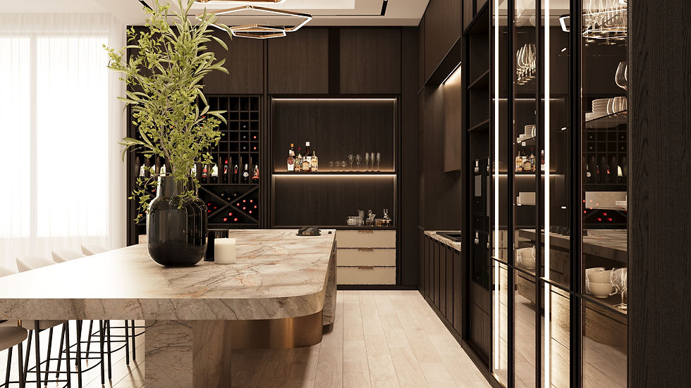 Originating from California, the homeowner envisioned a modern design inspired by the state's contemporary style. Embracing this vision, we curated a dark mood board for the property, featuring wood paneling throughout the first floor. Light hardwood floors, bronze glass details, and strategically placed mirrors were selected to reflect light, infusing the space with a sense of drama and sophistication while honoring the owner's Californian roots